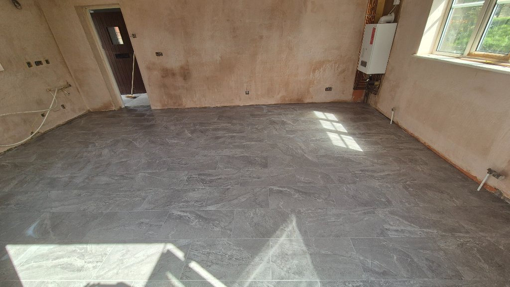 Tiling the main ground-floor living areas of a modernised family home. A clean, contemporary finish using large-format porcelain tiles to create a seamless flow throughout the property.