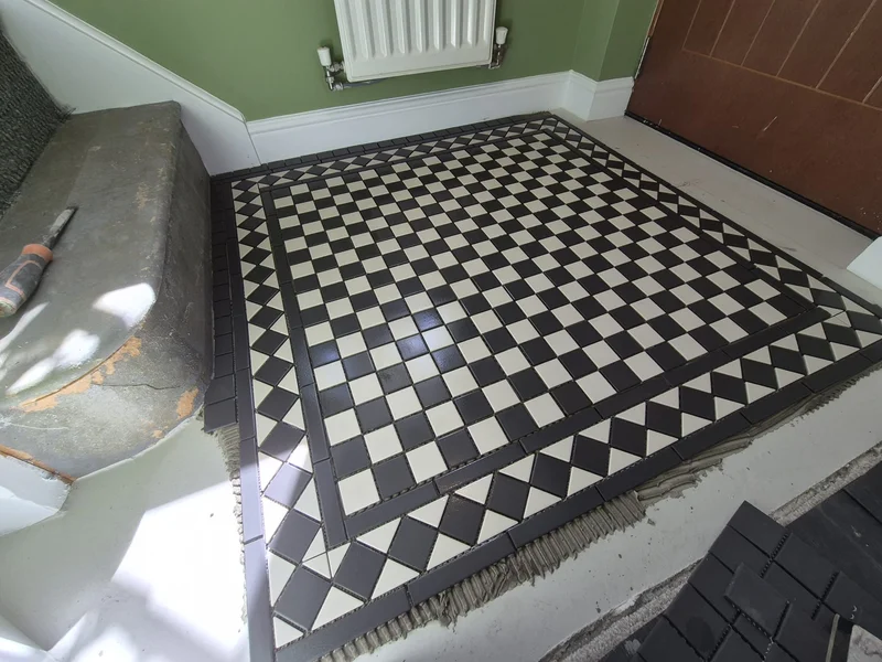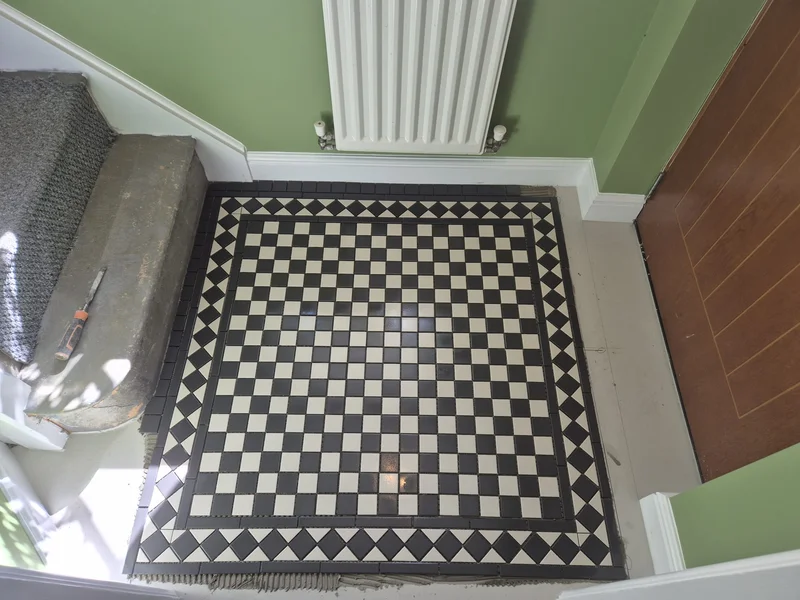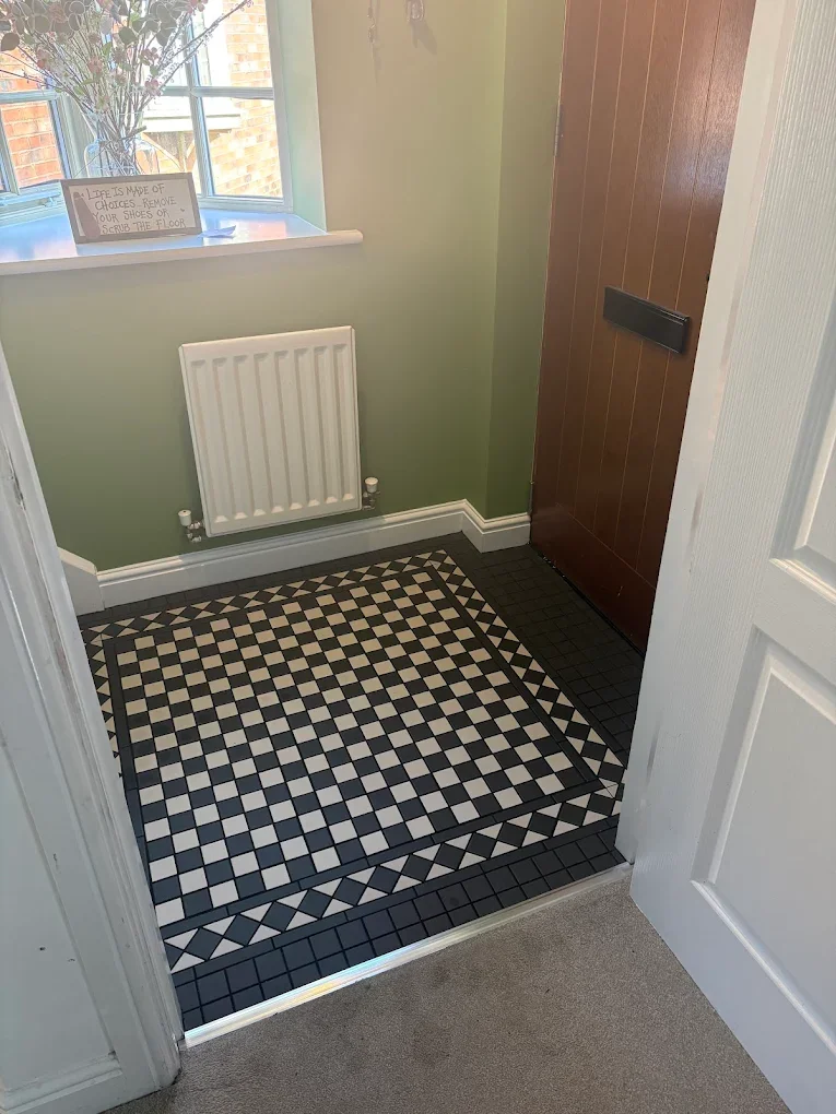 This Victorian-style mosaic hallway floor was completed in Warrington, a classic and challenging project requiring careful planning and precise installation. The mosaic pattern and decorative border demanded accurate layout work to ensure symmetry throughout the space. The fully prepared base using self-levelling compound ensured a solid, level foundation for the intricate tilework, and meticulous cutting around walls, steps, and doorways created a finished result that balances traditional aesthetics with modern installation standards.