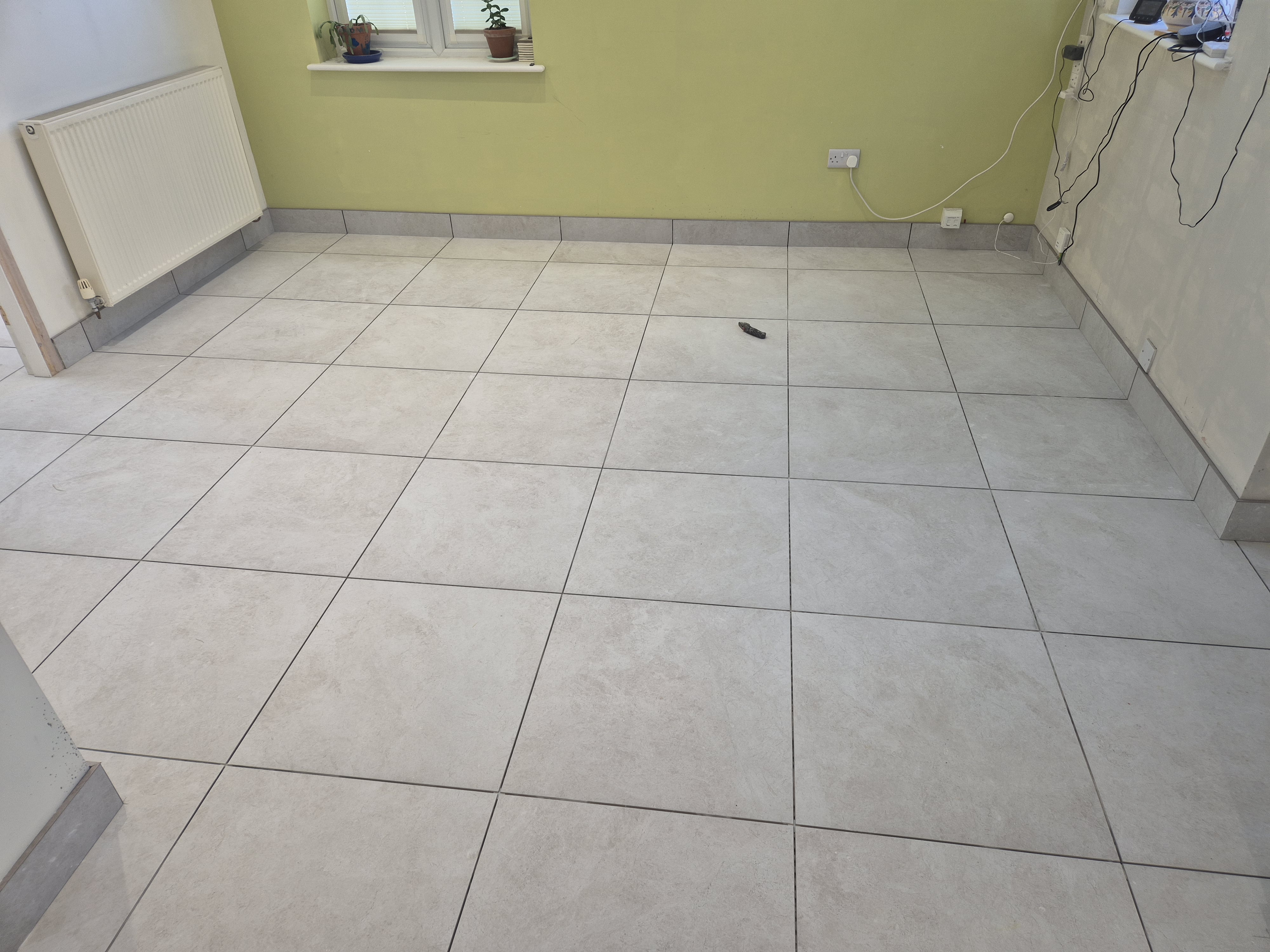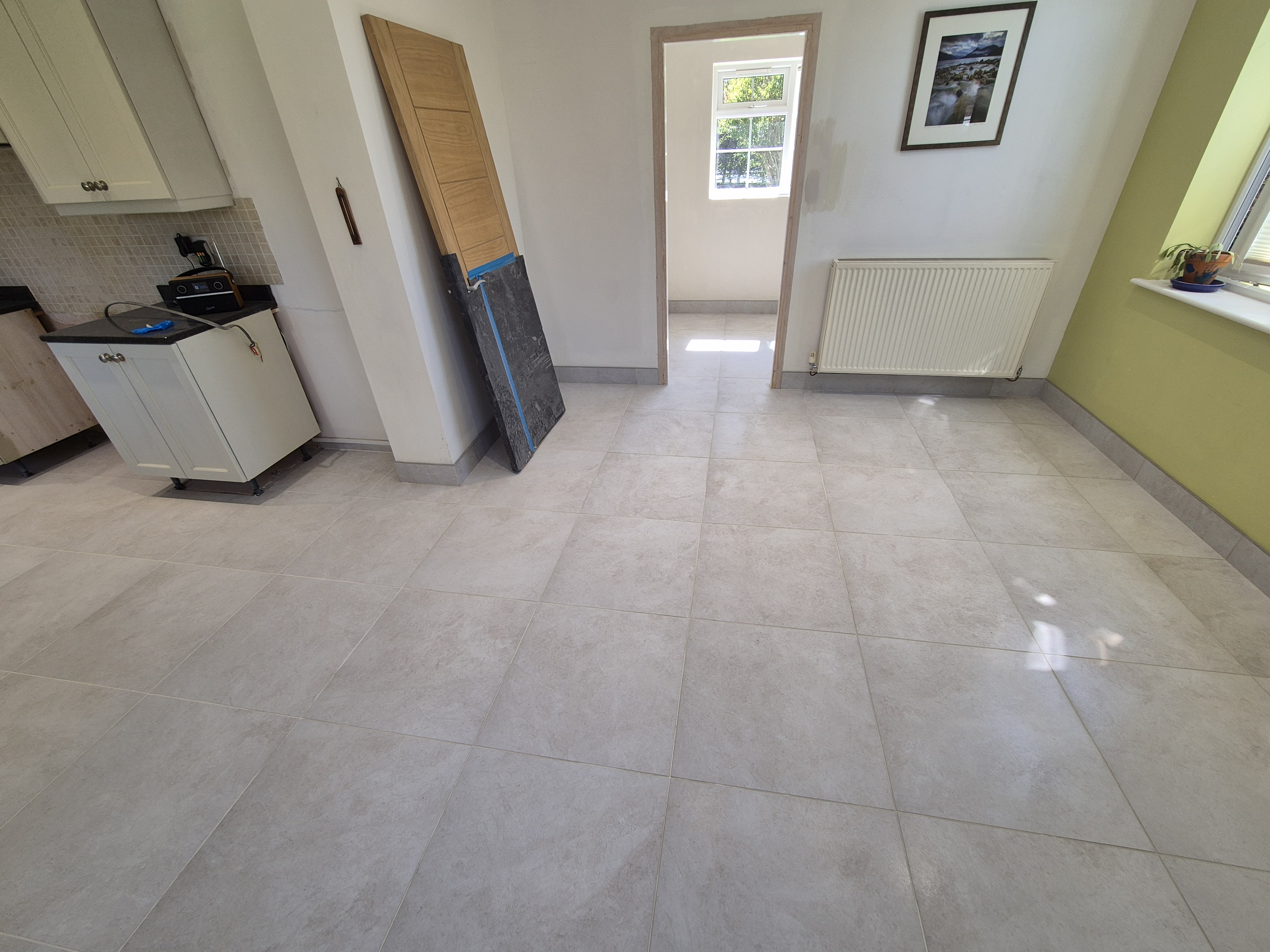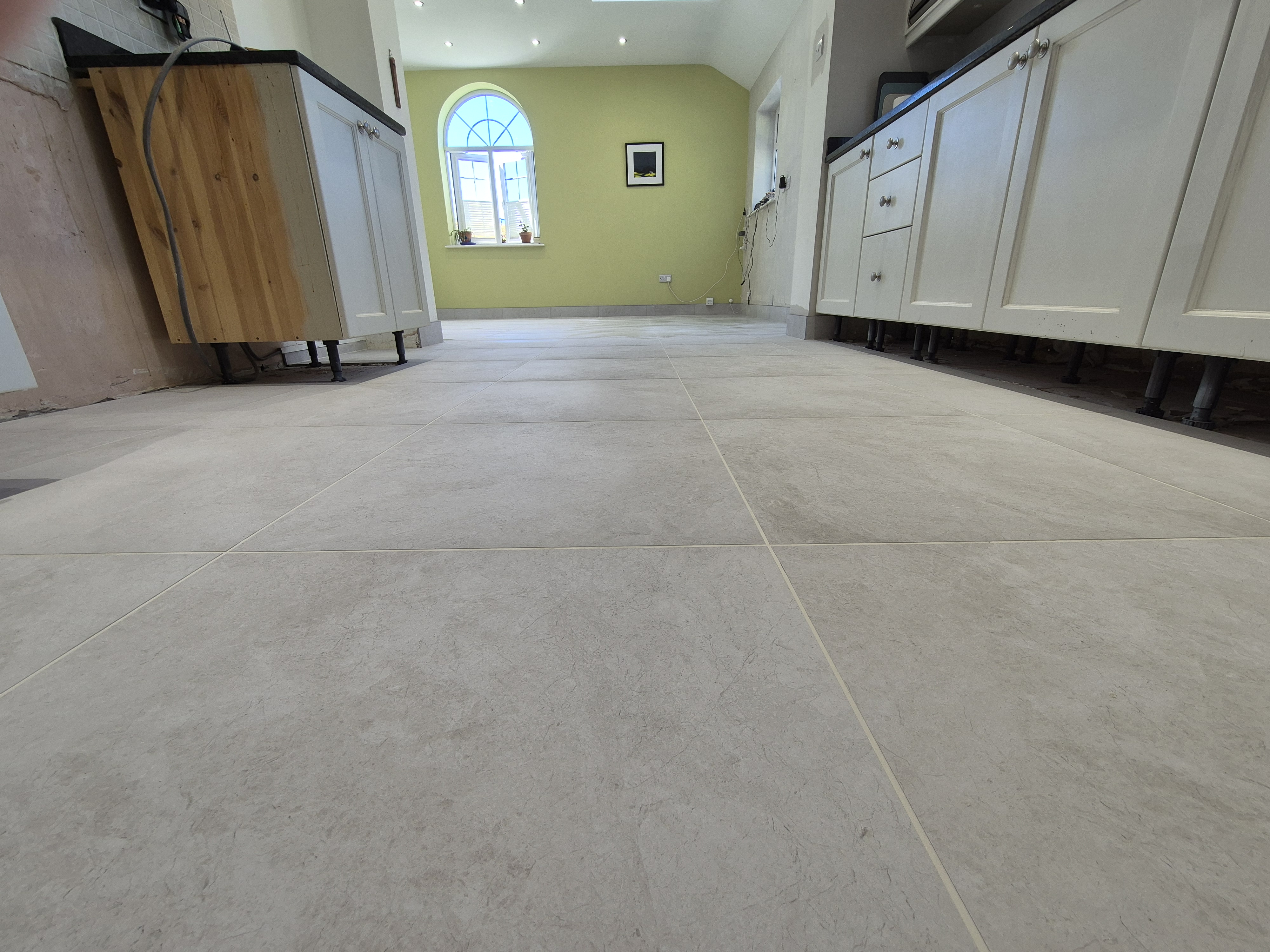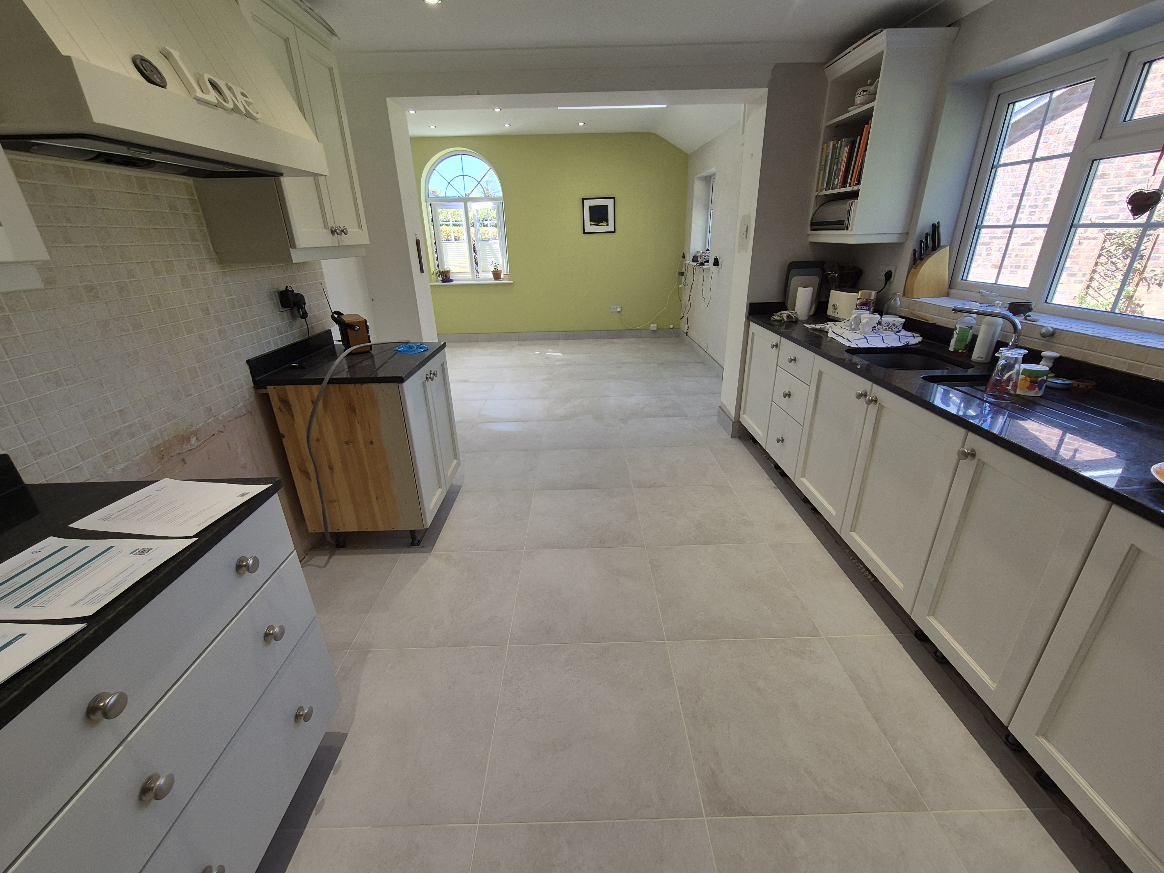 Full kitchen floor replacement in Frodsham, including removal of the existing tiled floor, cleaning, priming, self-levelling preparation and installation of large-format 600x600 porcelain tiles with tiled skirts for a clean contemporary finish.