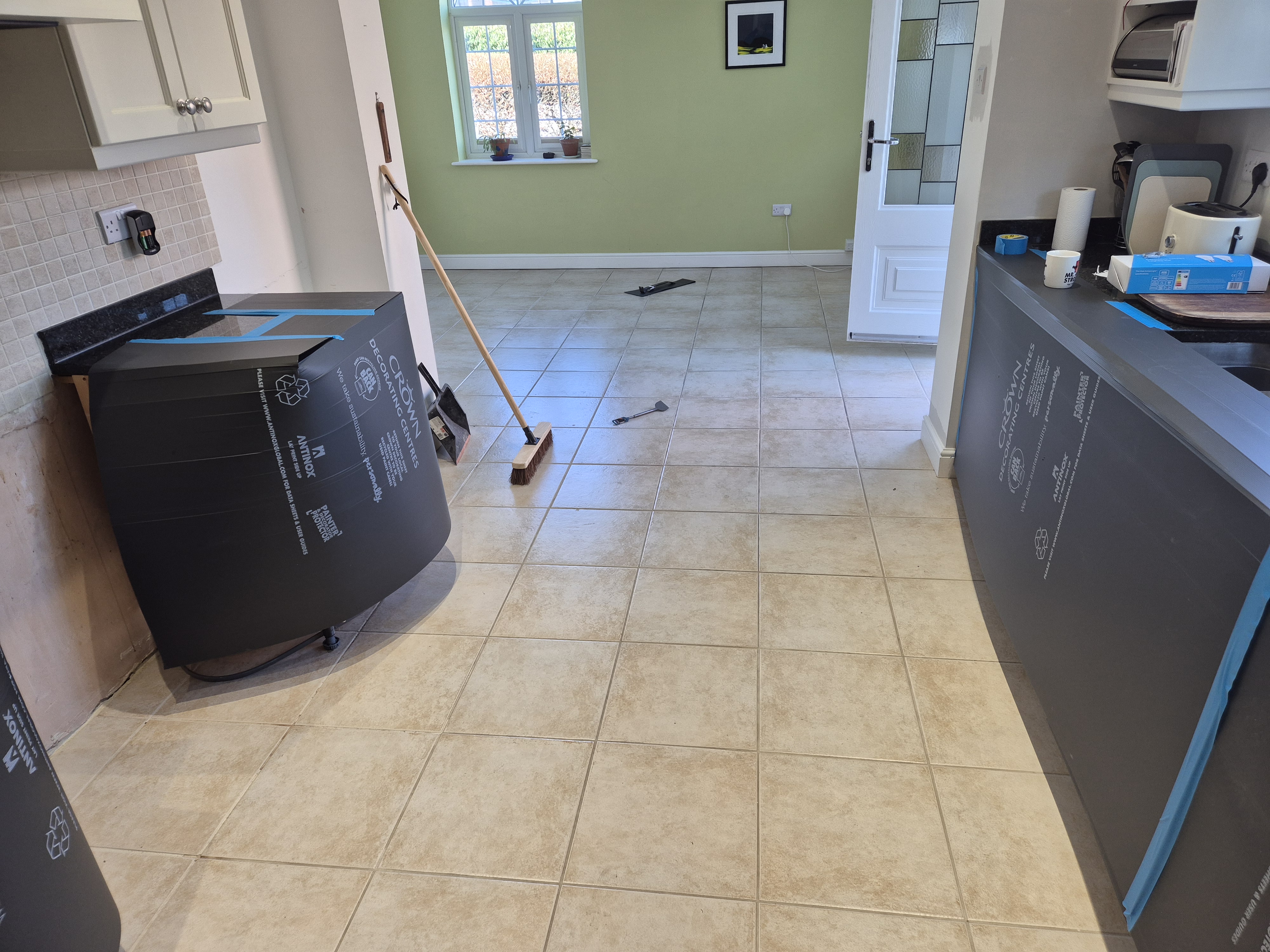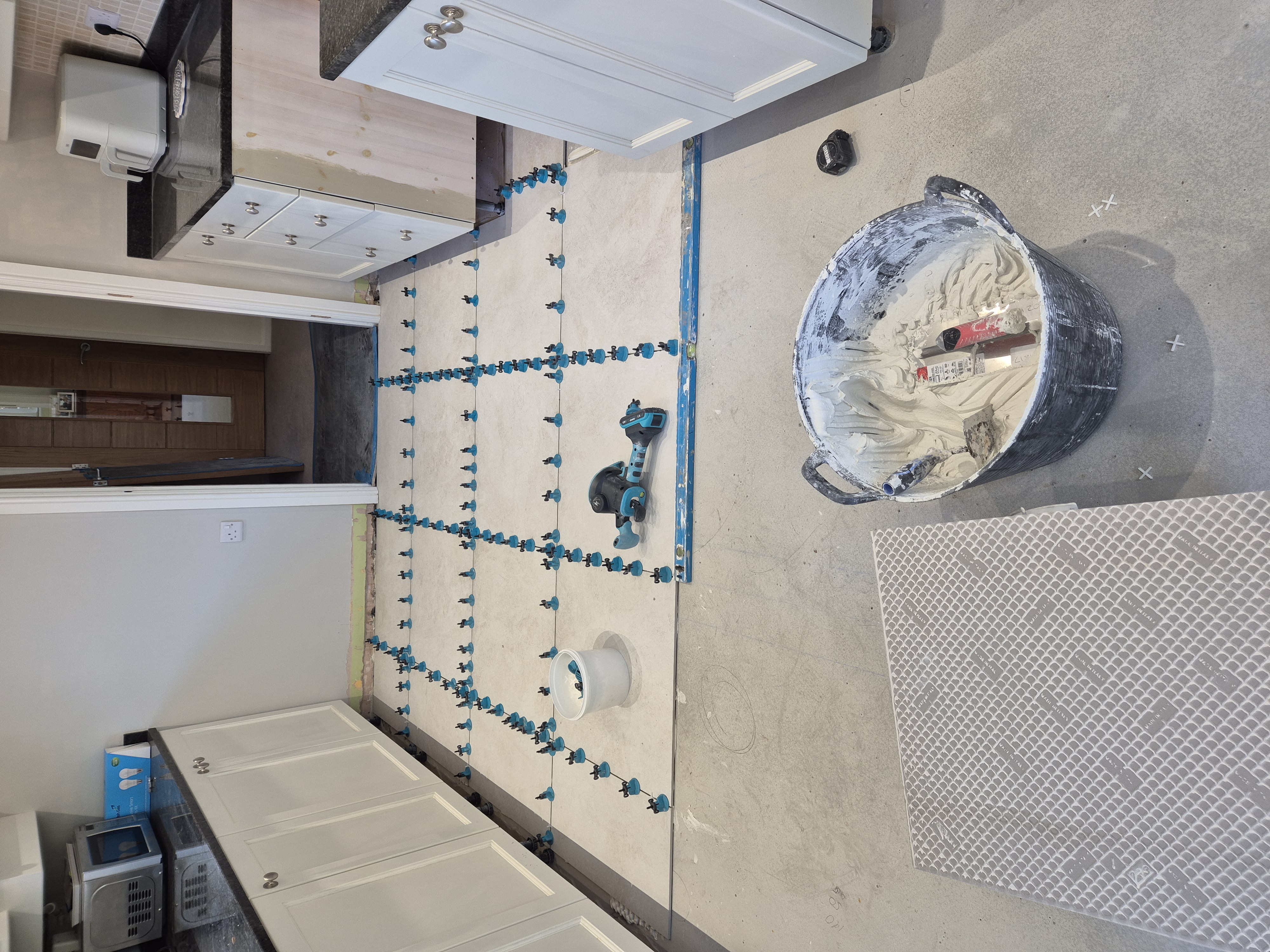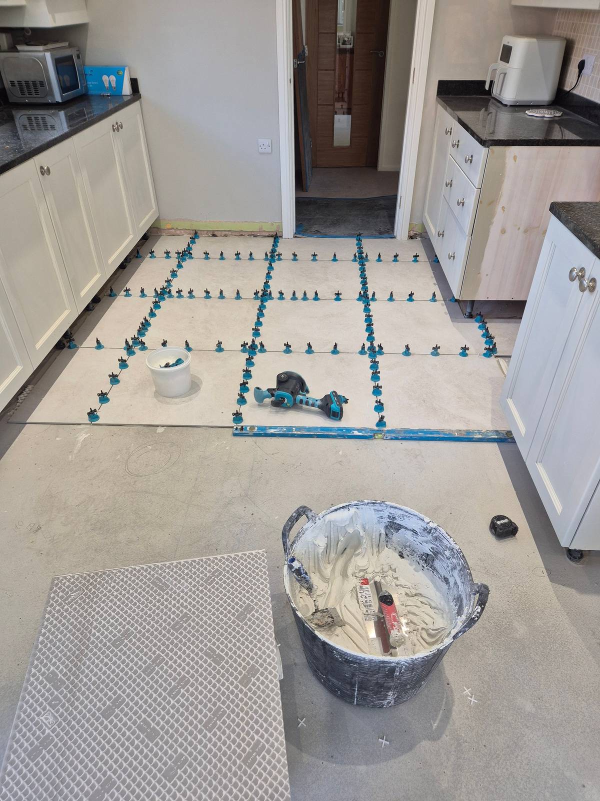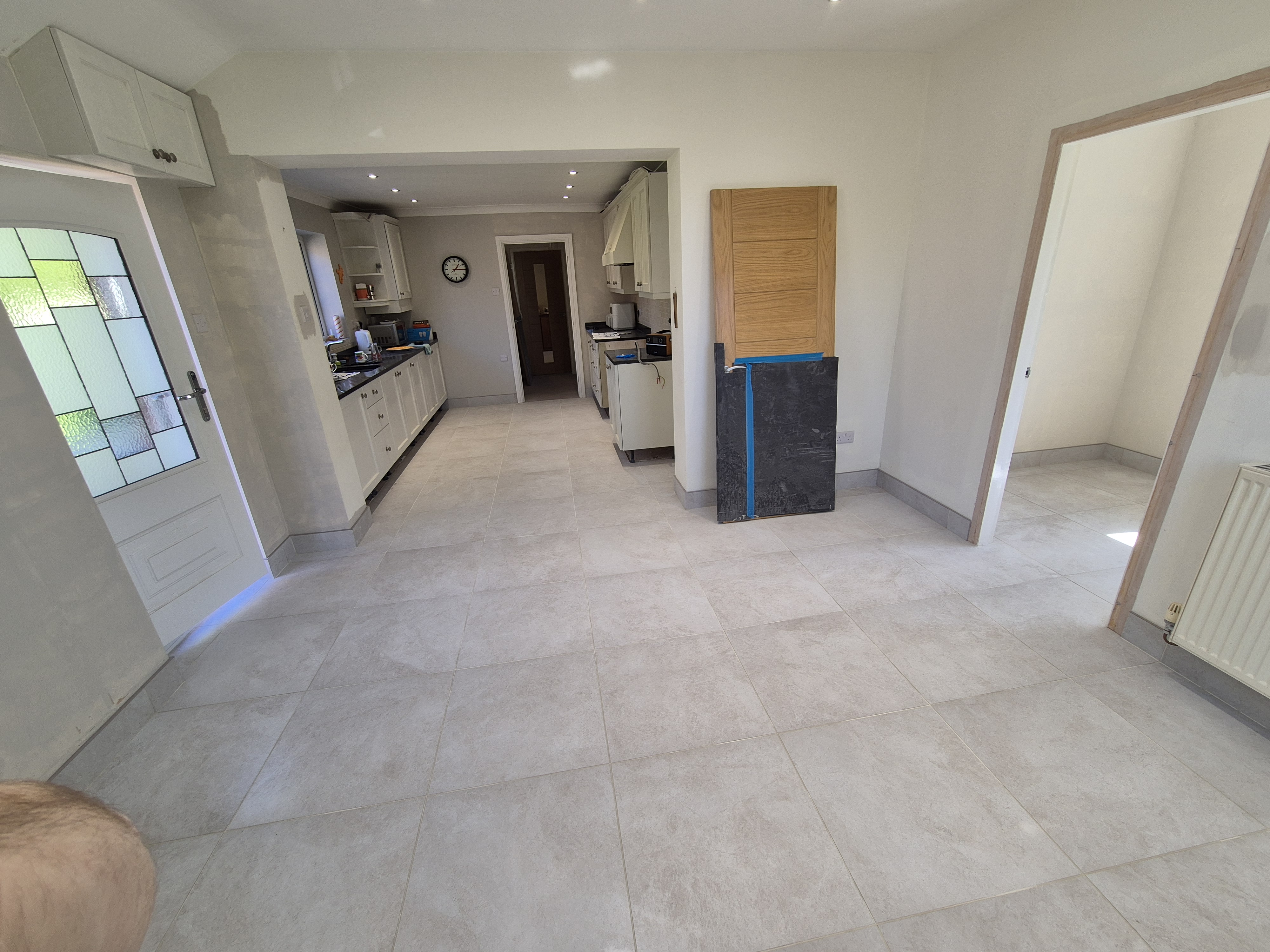 Full kitchen floor replacement in Frodsham, including removal of the existing tiled floor, cleaning, priming, self-levelling preparation and installation of large-format 600x600 porcelain tiles with tiled skirts for a clean contemporary finish.