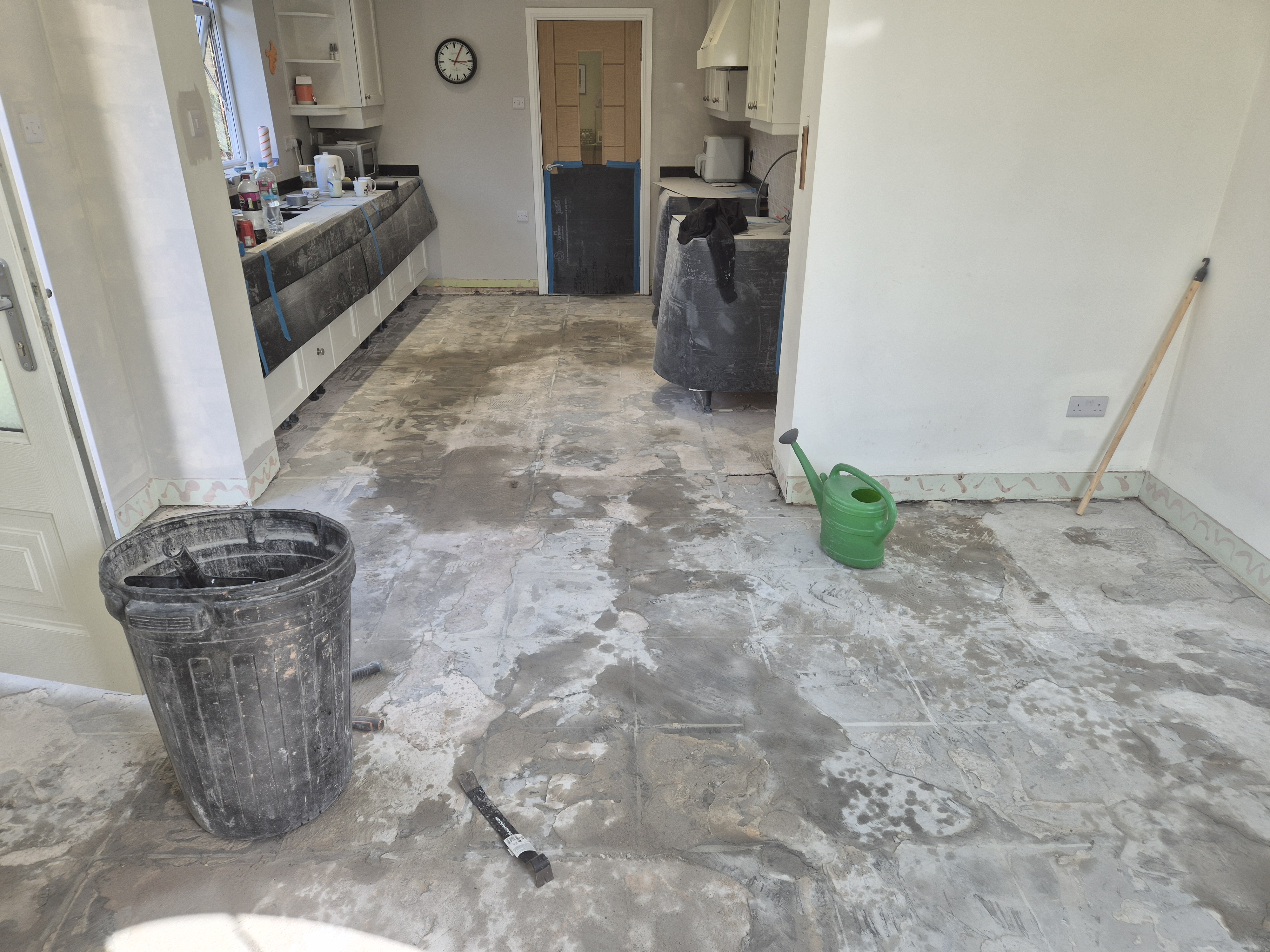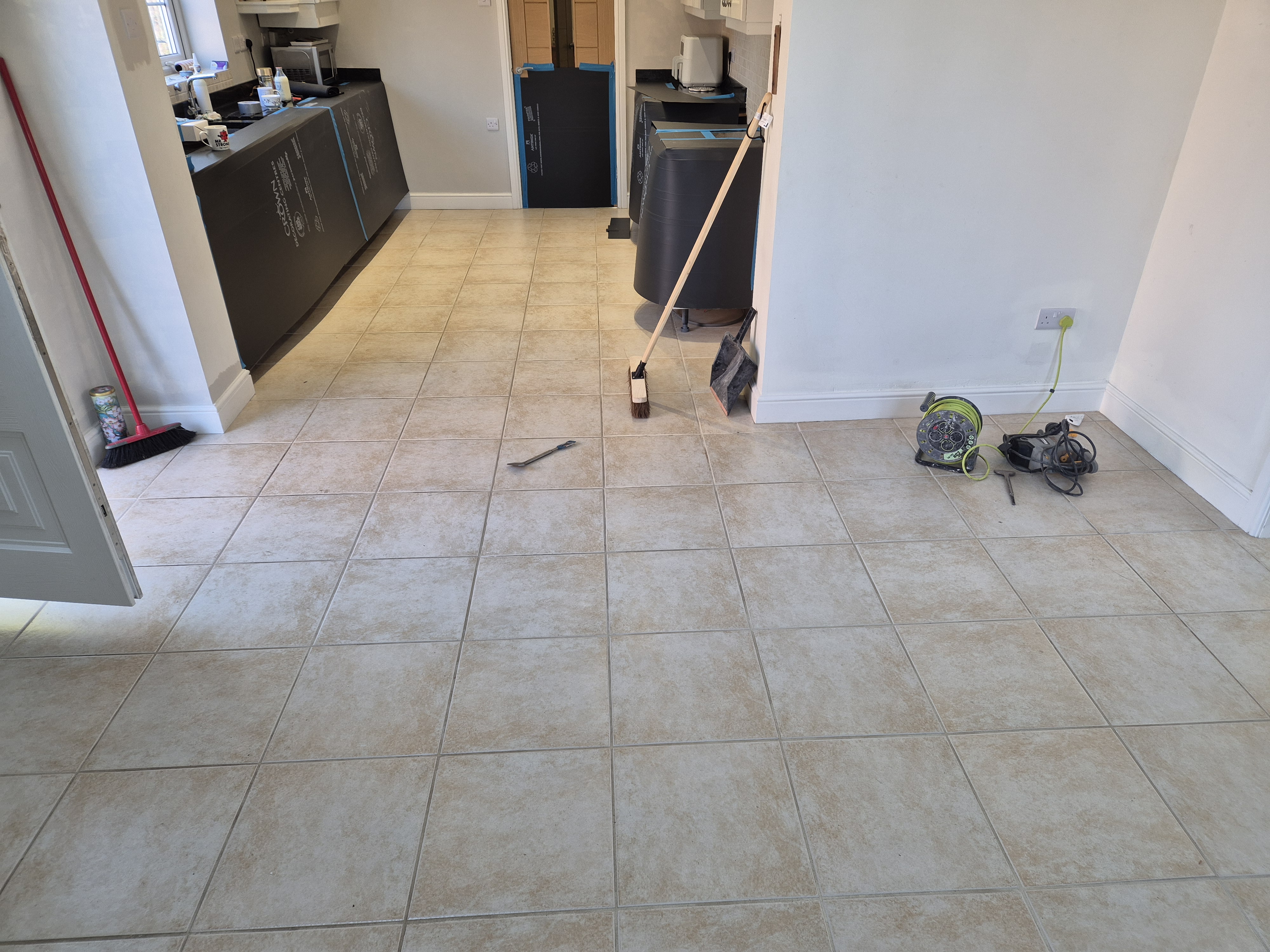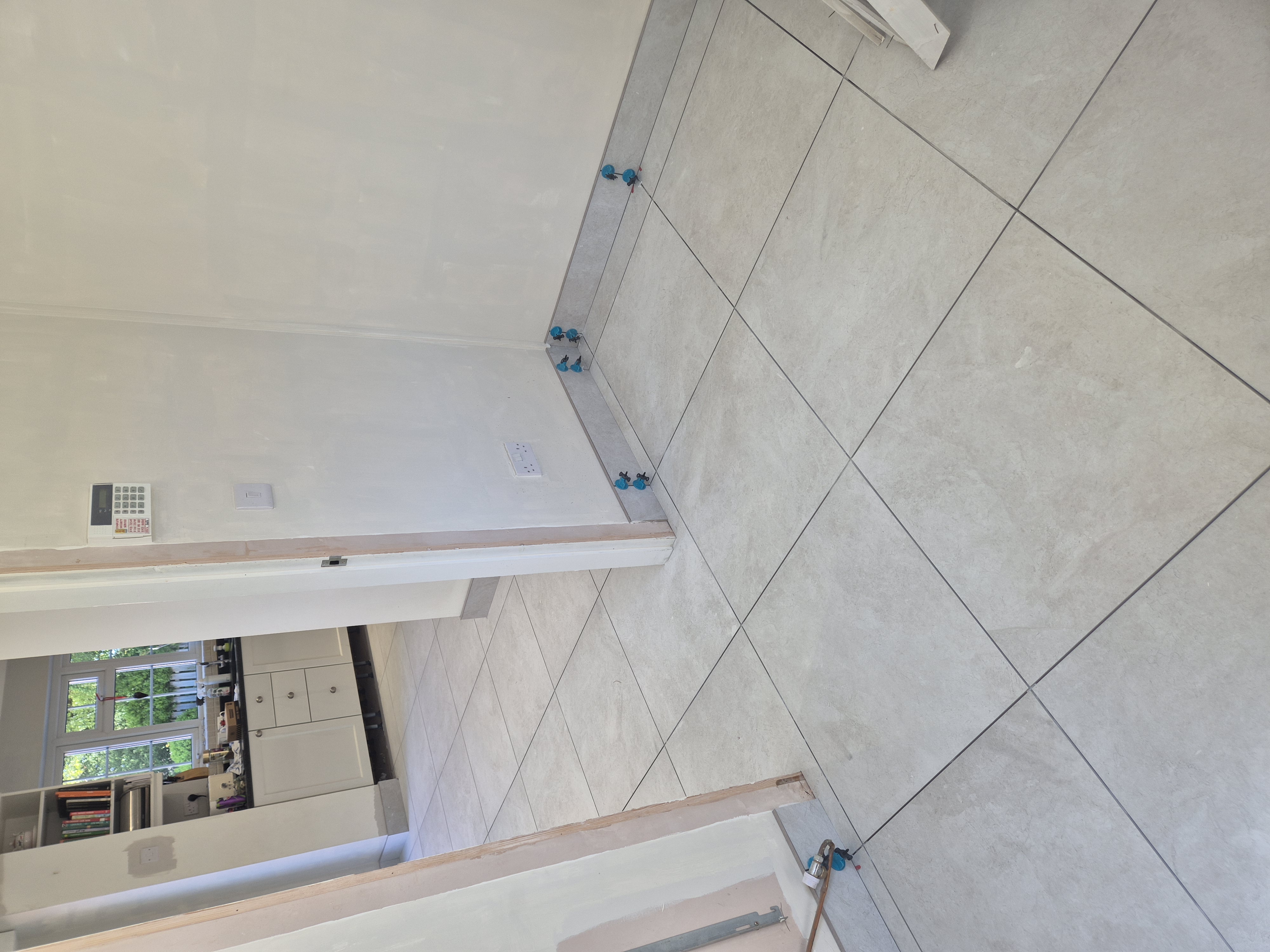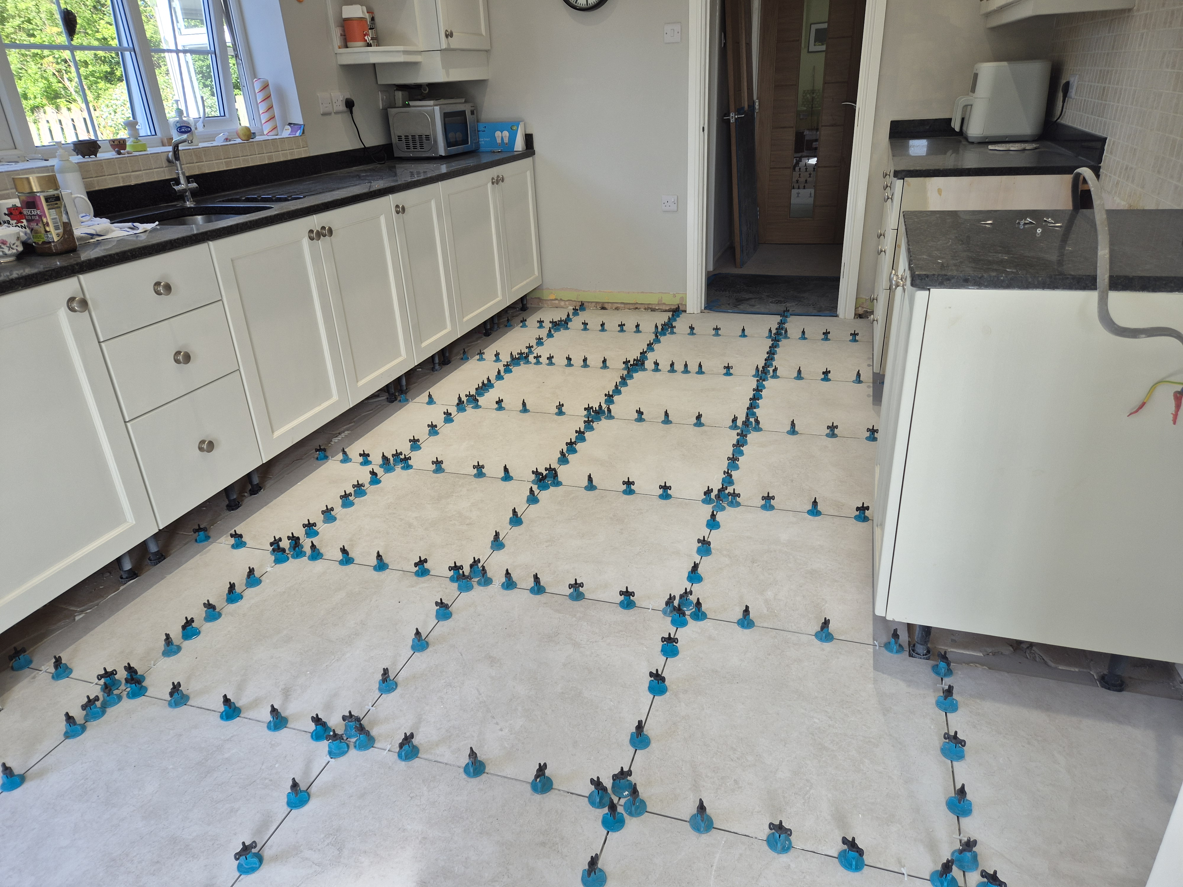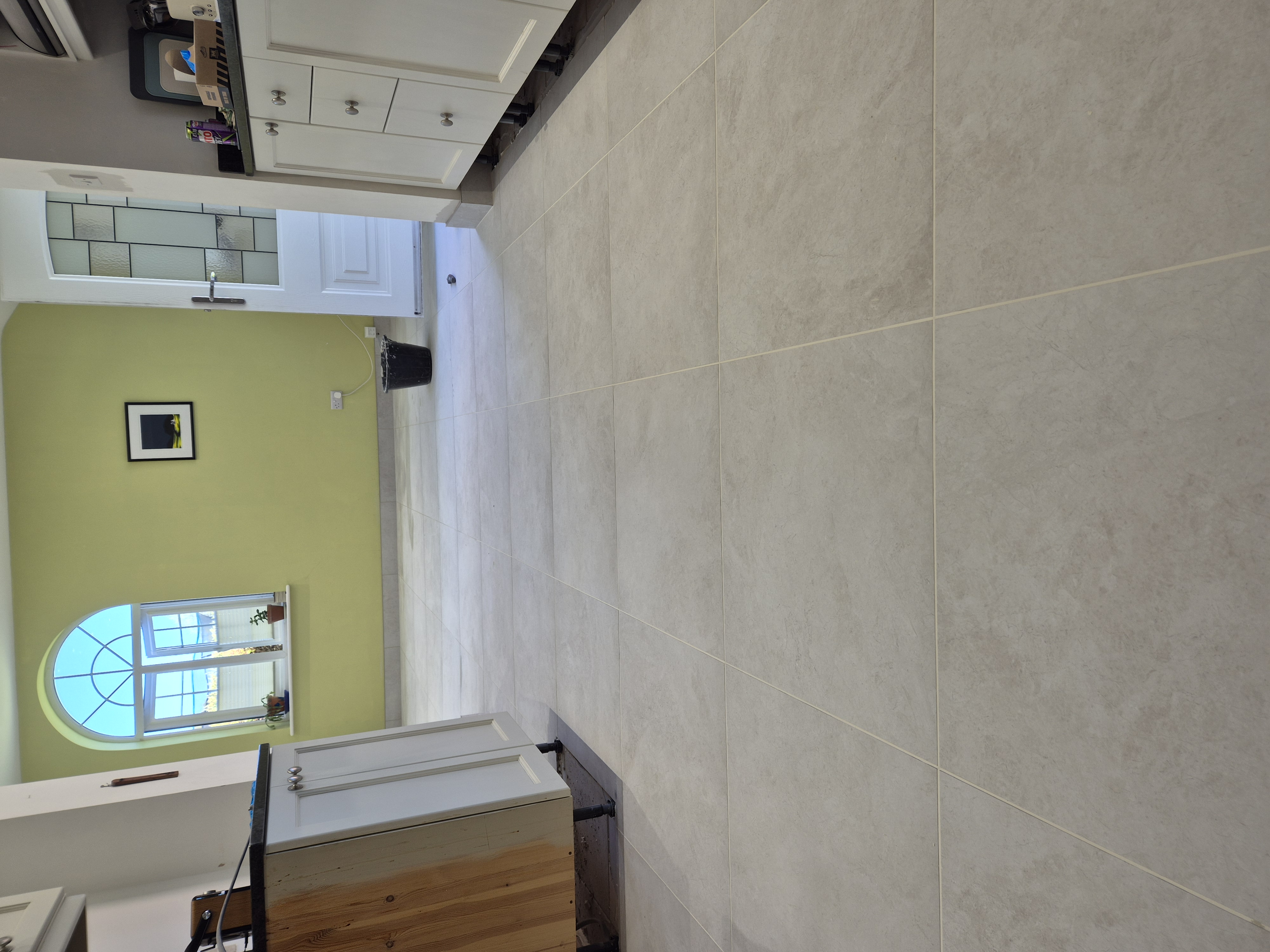 Full kitchen floor replacement in Frodsham, including removal of the existing tiled floor, cleaning, priming, self-levelling preparation and installation of large-format 600x600 porcelain tiles with tiled skirts for a clean contemporary finish.
