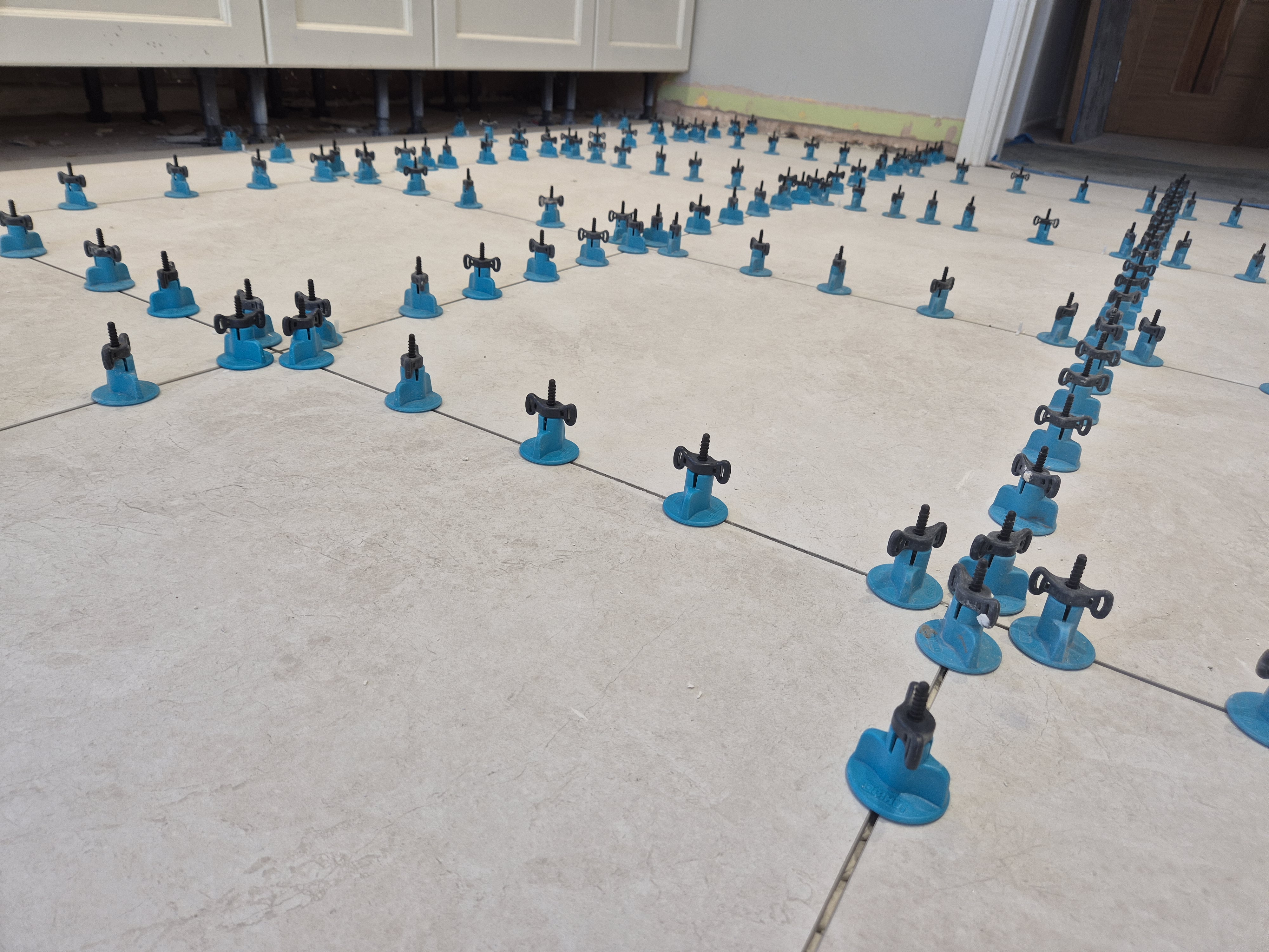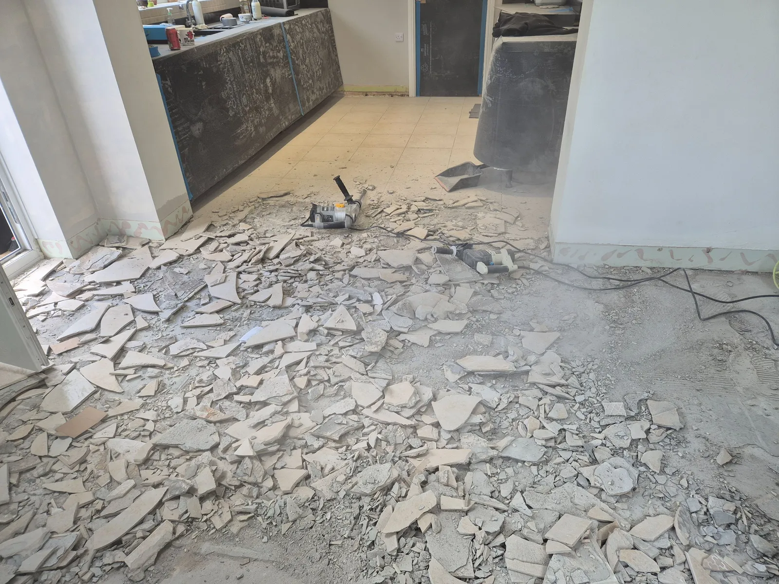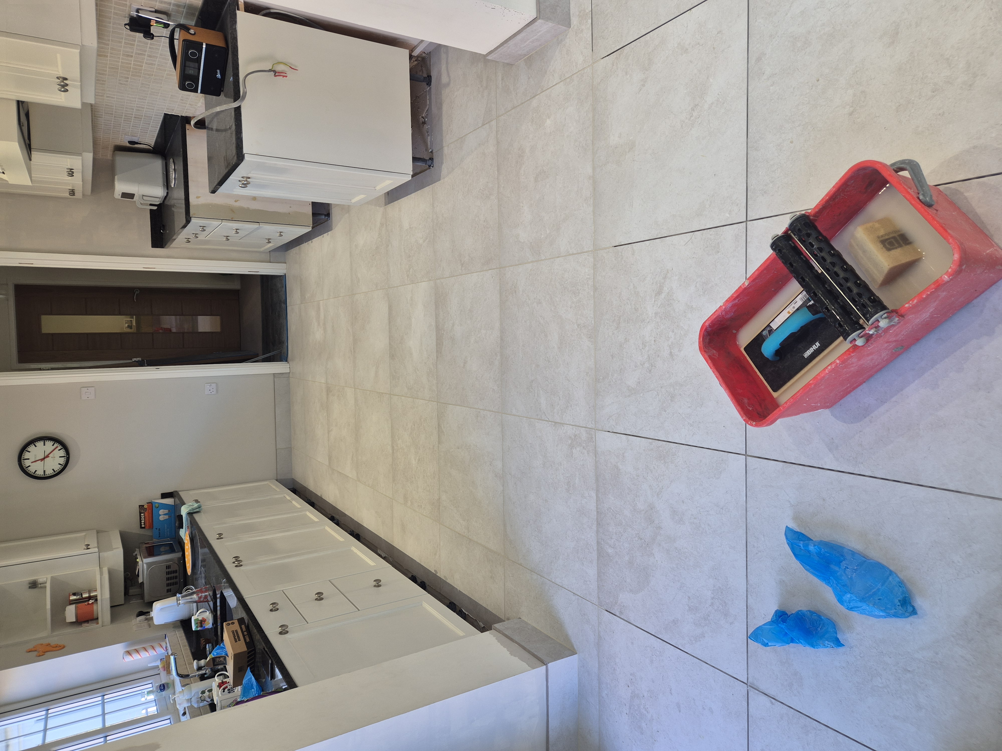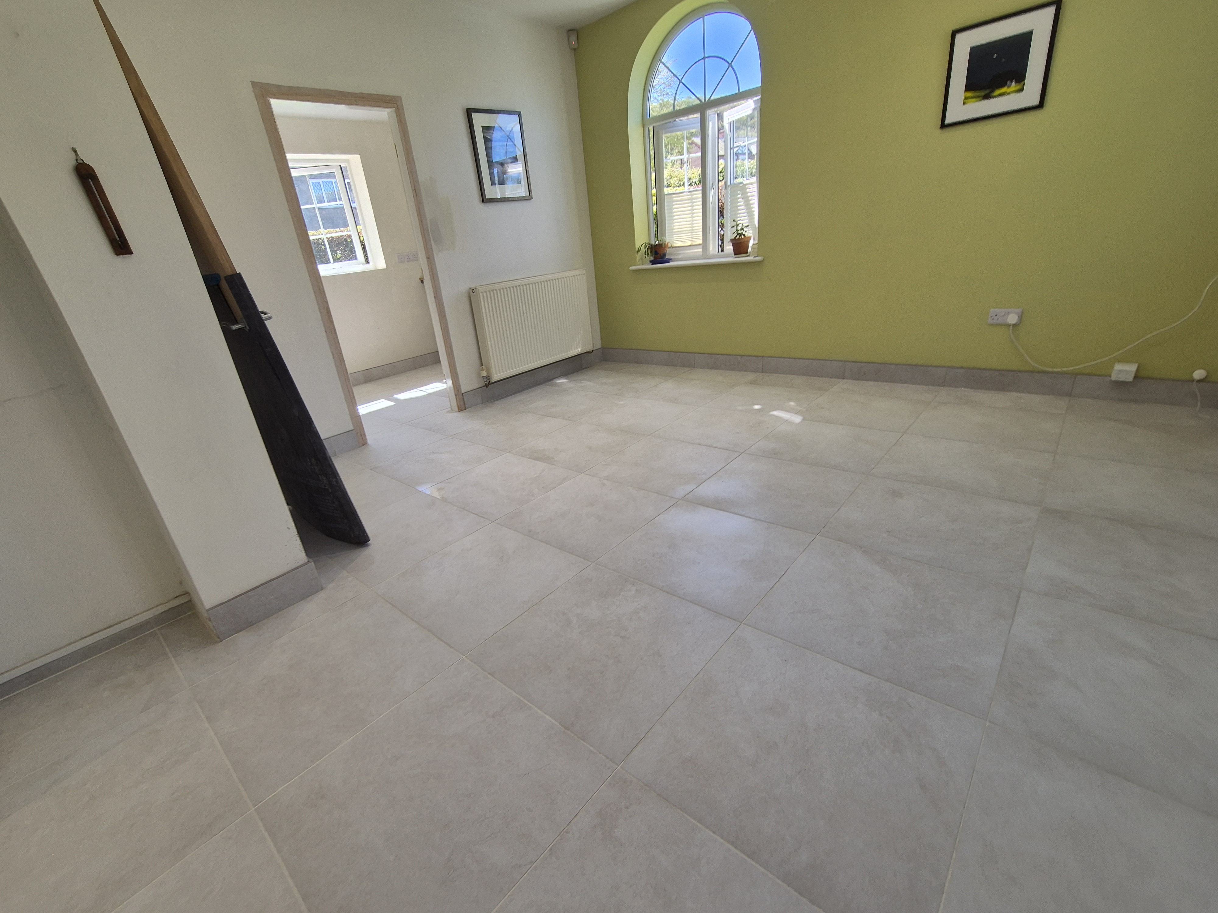 Full kitchen floor replacement in Frodsham, including removal of the existing tiled floor, cleaning, priming, self-levelling preparation and installation of large-format 600x600 porcelain tiles with tiled skirts for a clean contemporary finish.