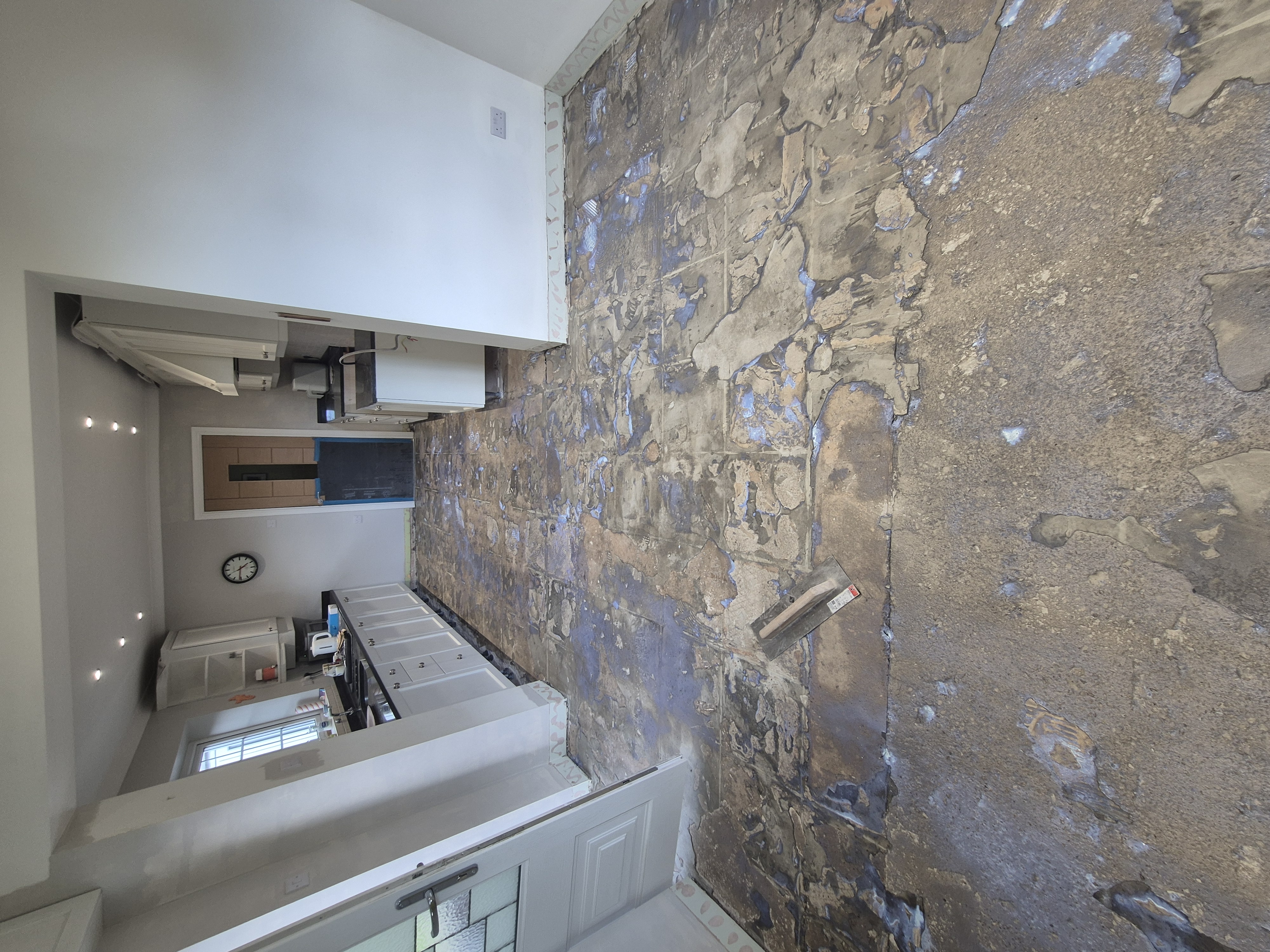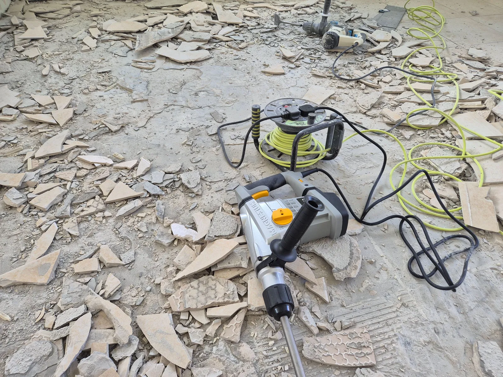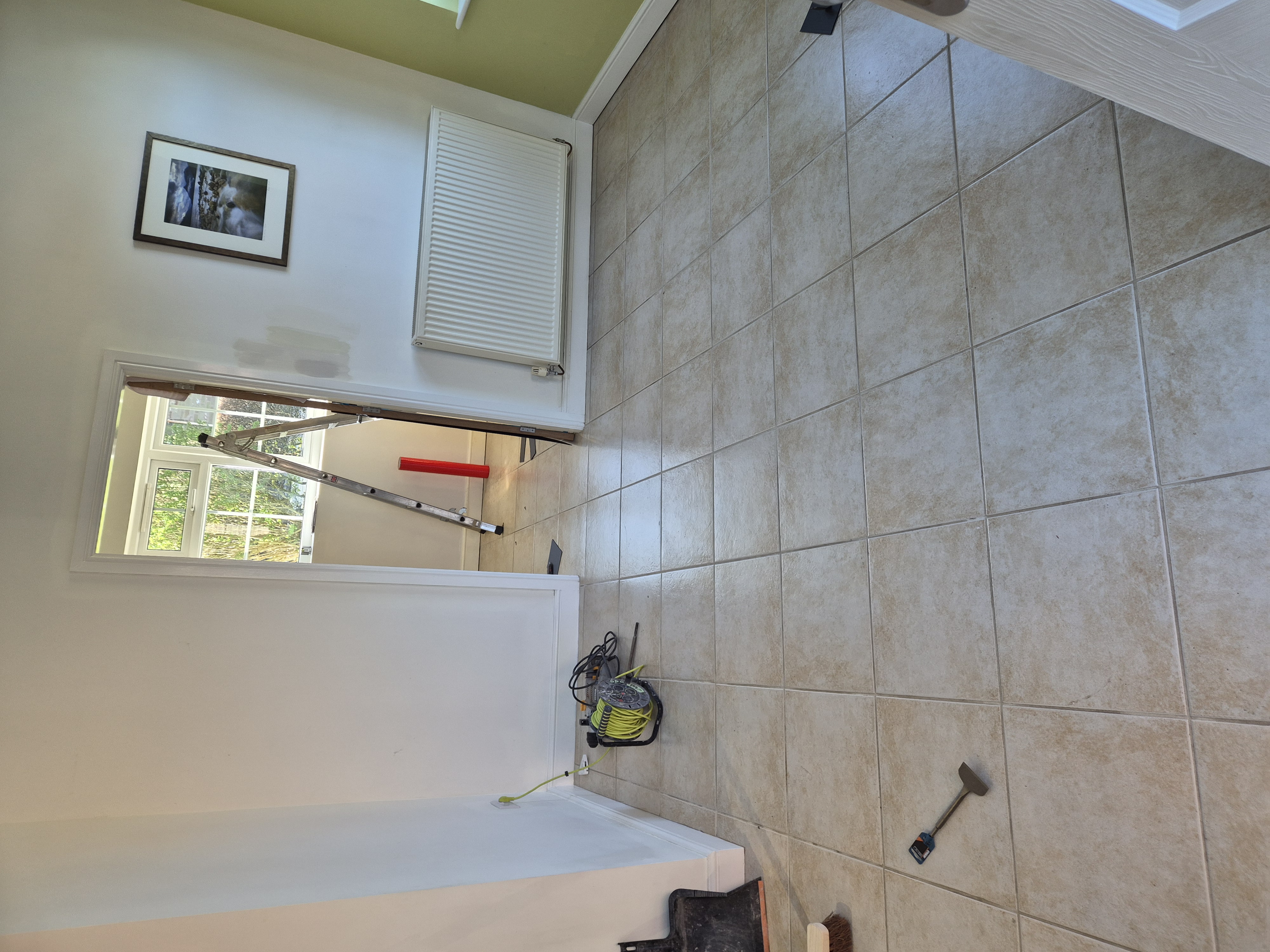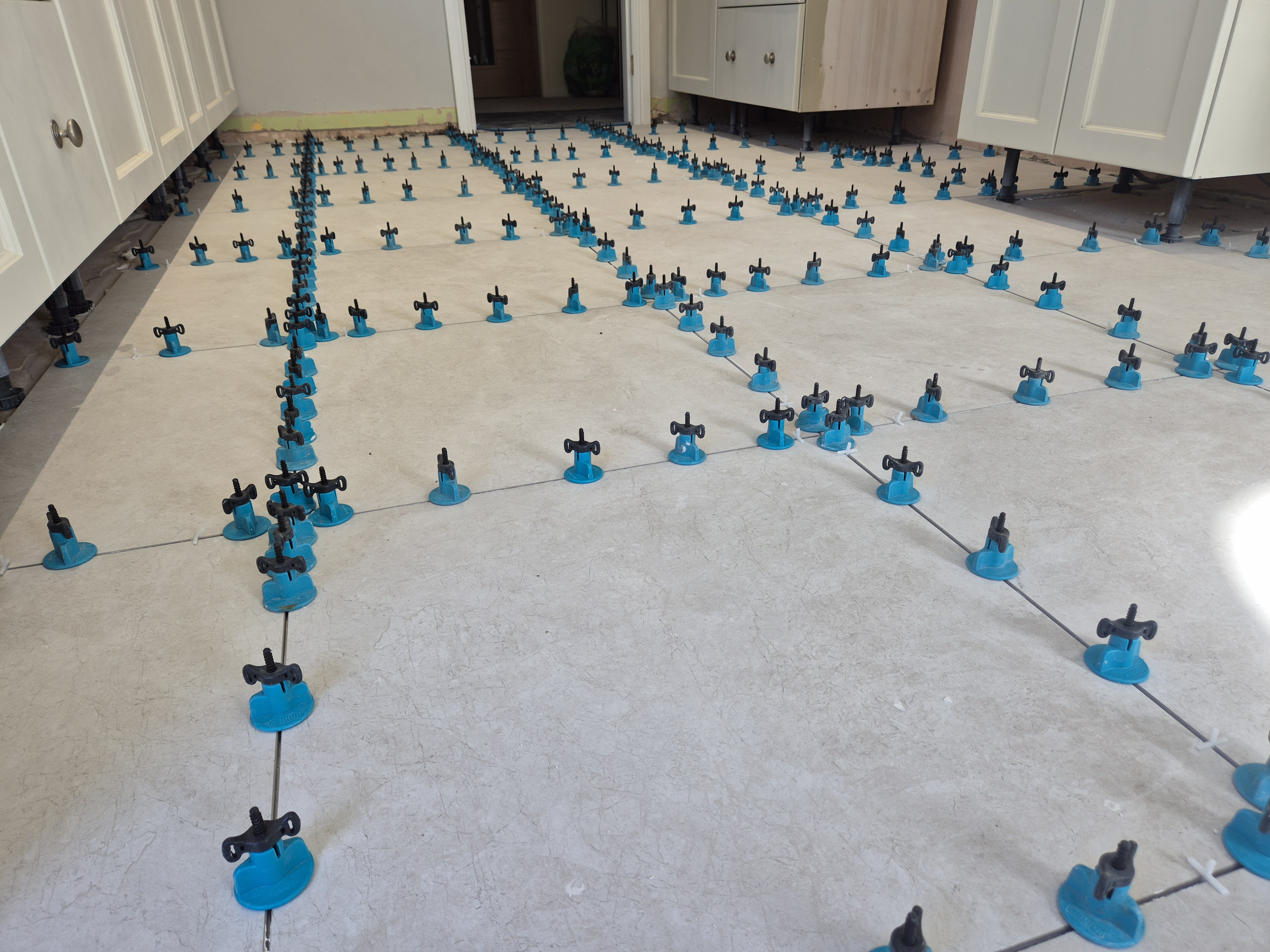 Full kitchen floor replacement in Frodsham, including removal of the existing tiled floor, cleaning, priming, self-levelling preparation and installation of large-format 600x600 porcelain tiles with tiled skirts for a clean contemporary finish.